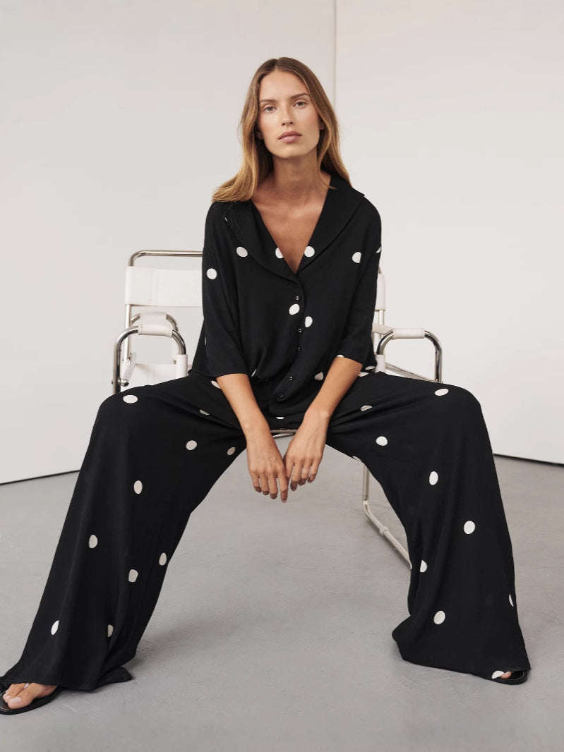 Middle East New Women's Fashion Casual Chiffon Print Blouse Broad Leg Trousers Set