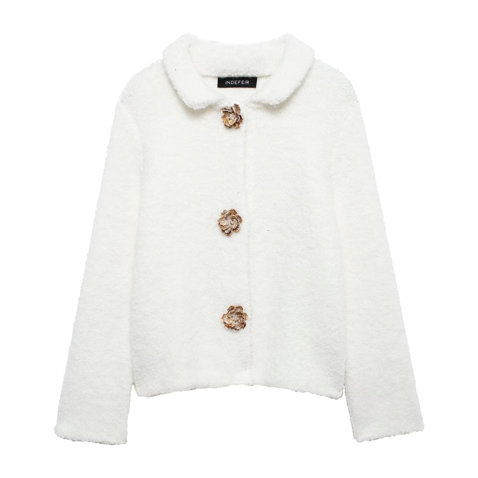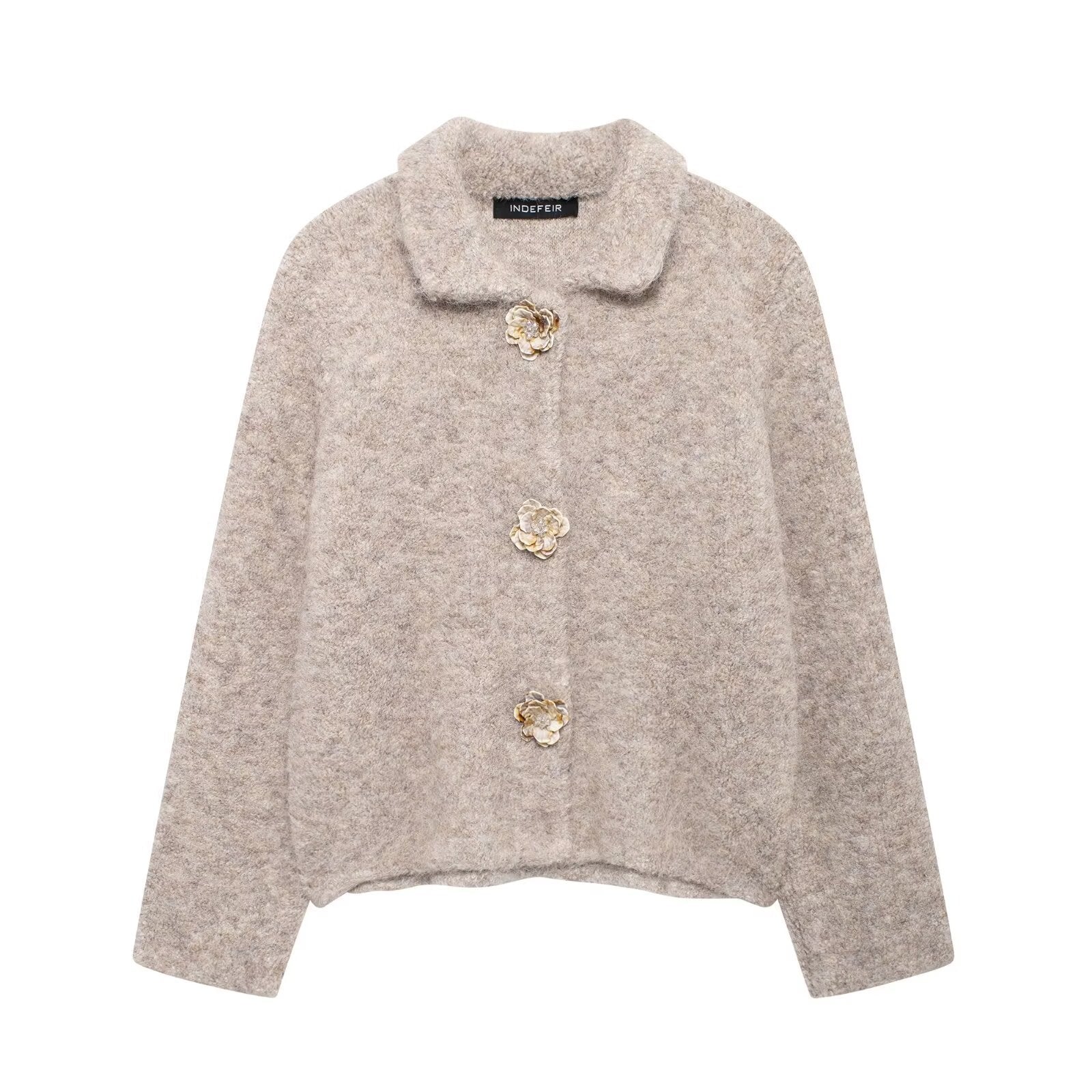 2025 Women's Autumn And Winter New Fashion Flower-Shaped Buckle Knitted Sweater Cardigan Jacket