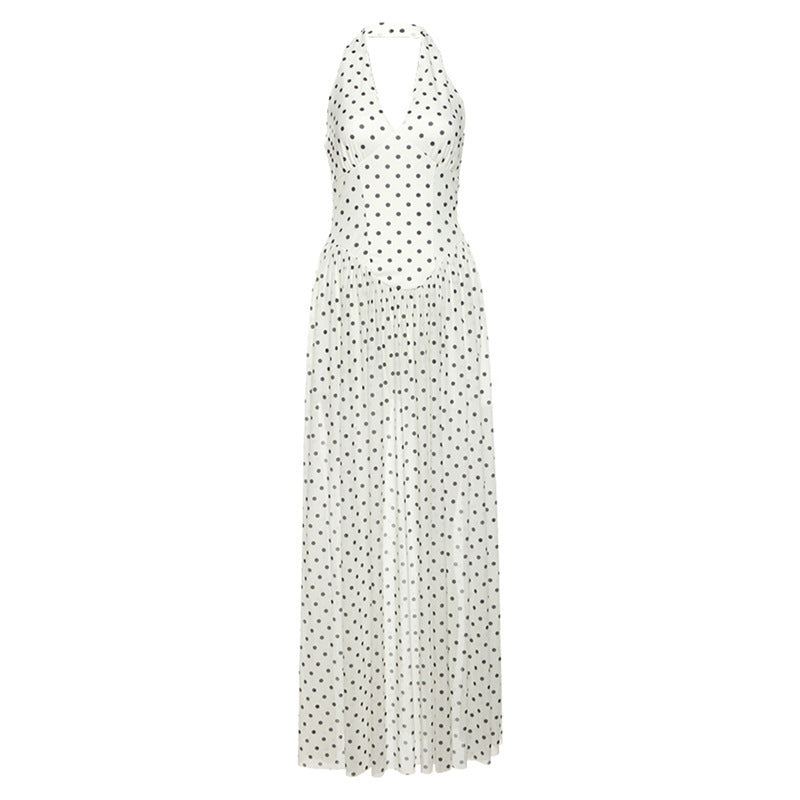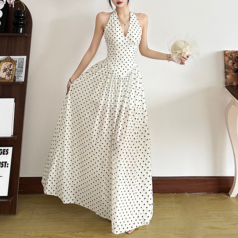 2025 Spring And Summer New Women's Dress French Sister Bo Dot Hanging Neck Dress Women's High Sense V To Receive The Waist Big Swing