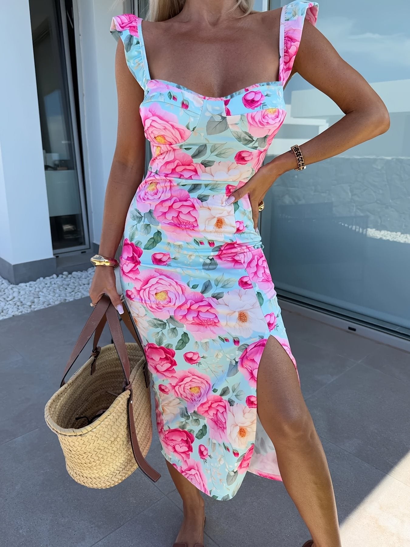 New Elegant Design French Flower Sling With Open Fork Mid-Long Ladies Dress In Summer 2025