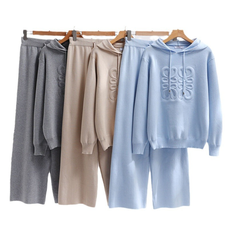 Fashion Suit Women's Korean Version Of Loose Knitted Hoodie Two Sets Of Leisure High-Rise Thin Straight Broad Leg Pants