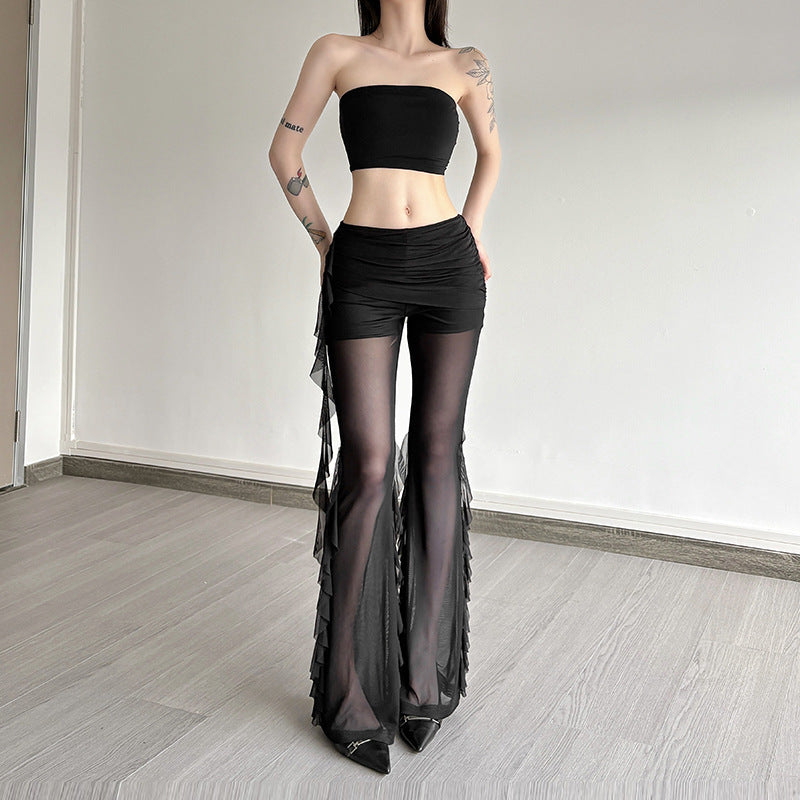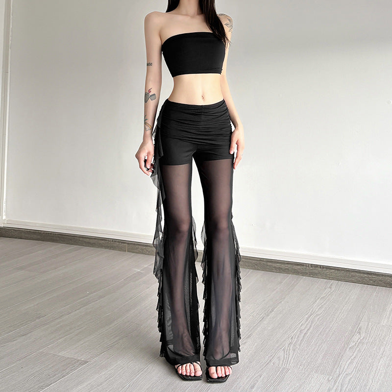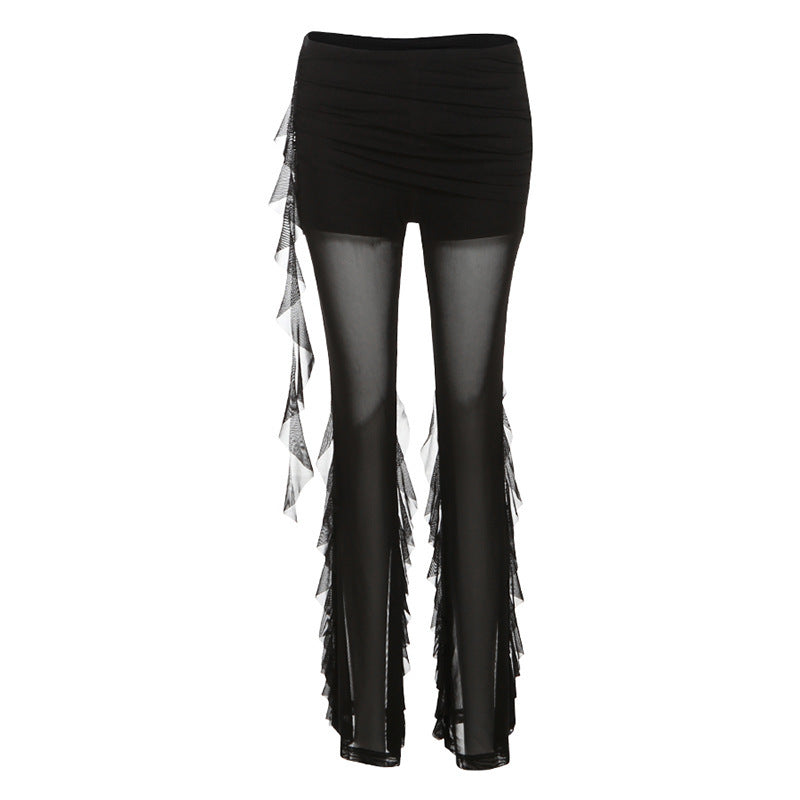 Fashion 2025 Summer New Women's Sexy Hottie Lotus Side Design Folding Mesh Splicing Perspective Leisure Pants