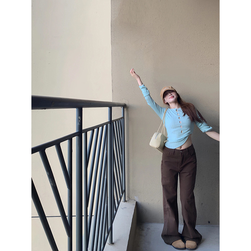Merard Retro Dark Brown Loose Thin Straight Jeans Women's New Low-Rise Thin Broad Leg Horn Pants