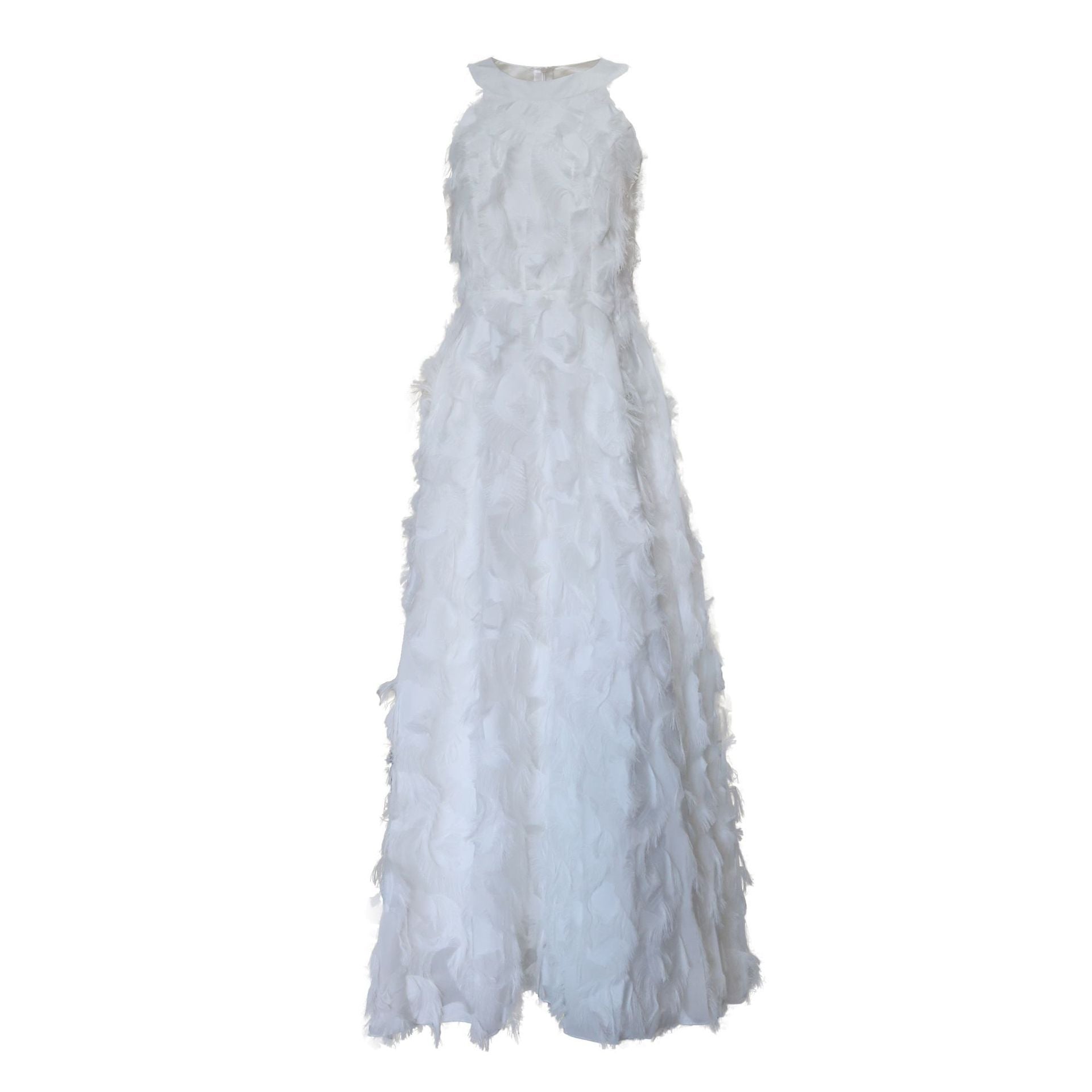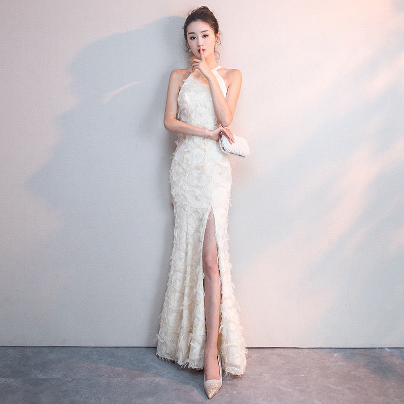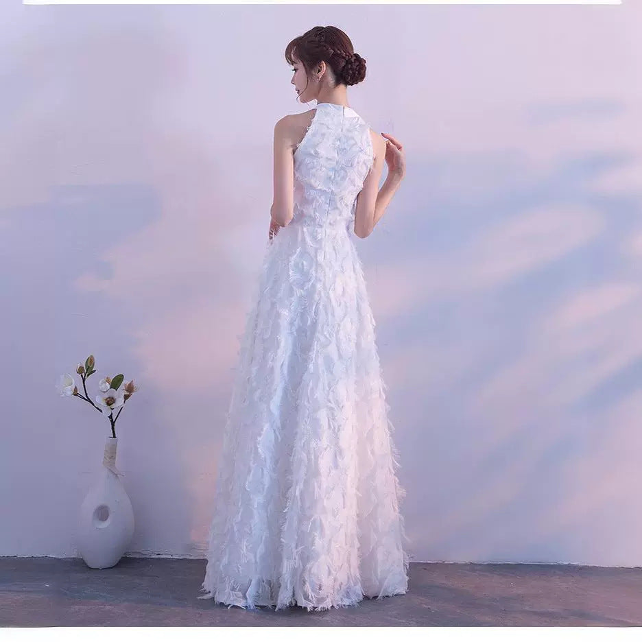 White Feather Hanging Neck Open Shoulder Fashion Atmosphere Thin Long Skirt Evening Dress Students Graduation Performance Choral Costume
