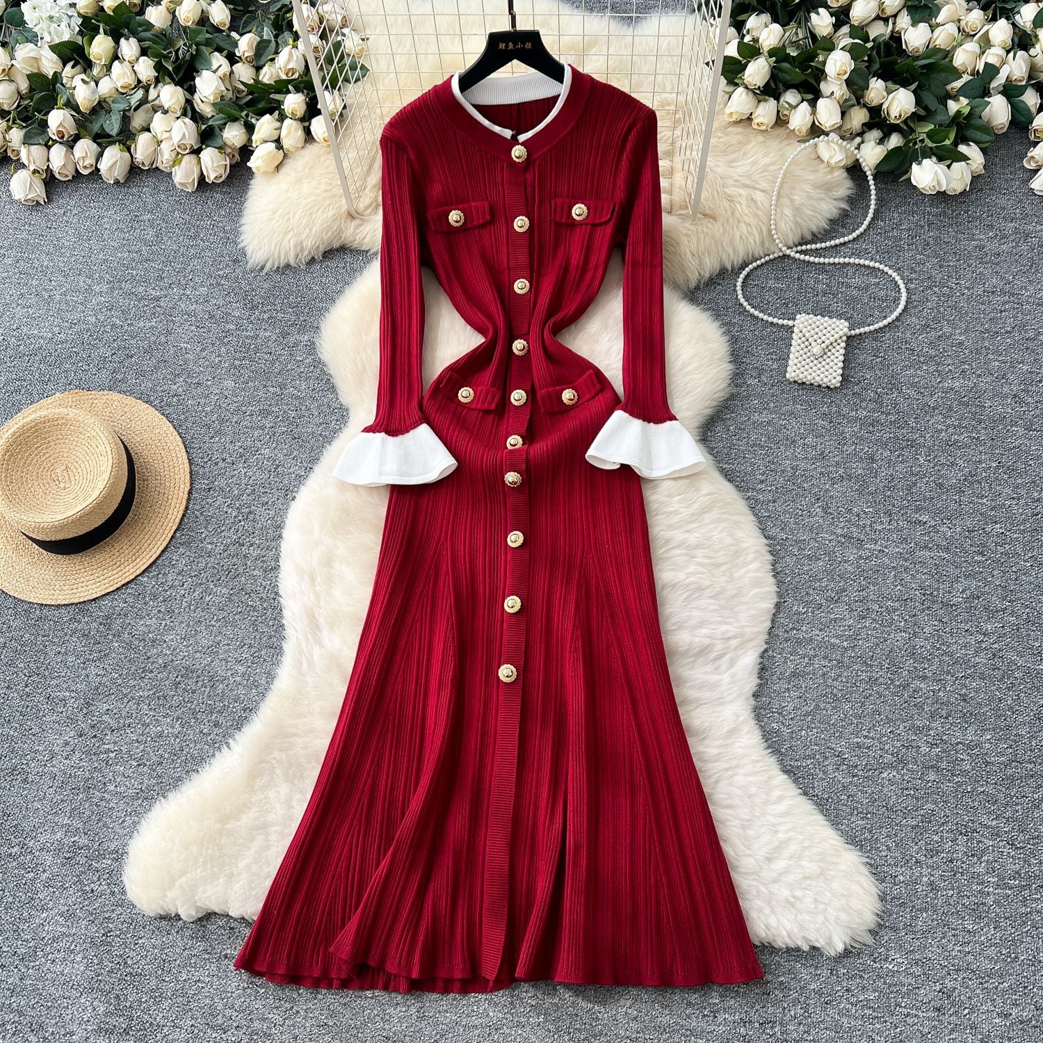 French Small Fragrant Wind Bumpy Round Collar Horn Sleeve Single Buckle Waist Knitted Dress Women Autumn Body Sweater Dress