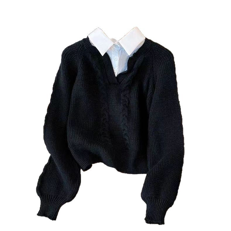 Sweater Autumn And Winter Splicing Women's Shirt Wear Design Niche Collar Loose Jaflage Shirt Fake Two