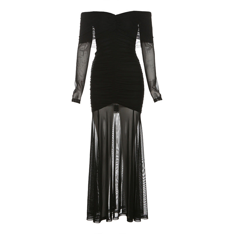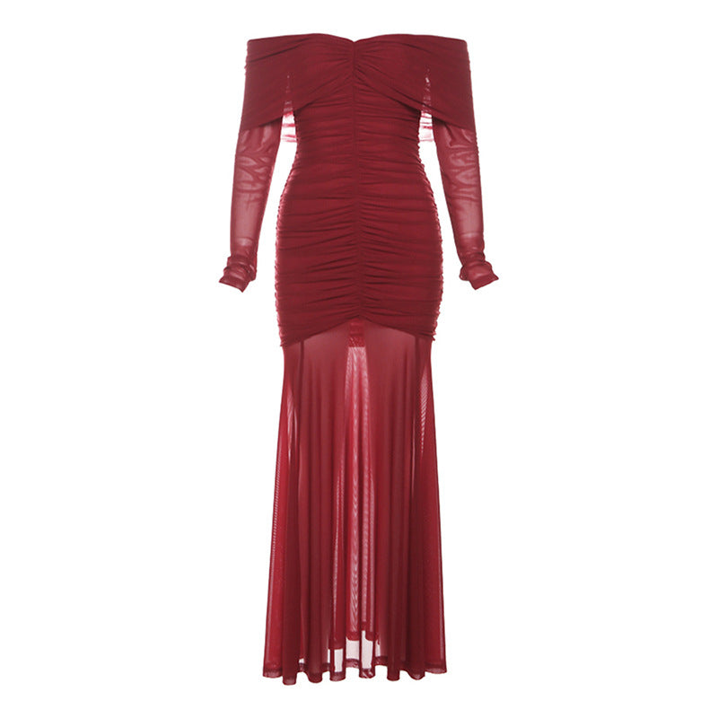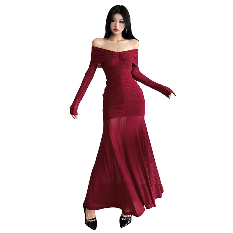 2025 Autumn And Winter New Women's Pure Color Temperament Sexy Word High Waist Waist Dress Dress Women