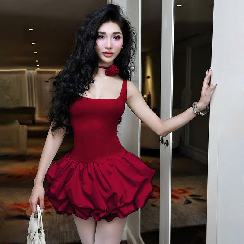 2025 Autumn And Winter Women's New Pure Color Temperament Sexy Square Collar Taut Puffed Skirt Sleeveless Dress Women