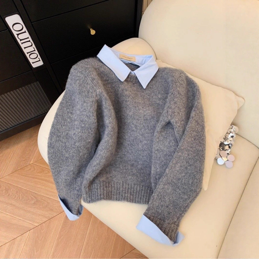 Autumn 2025 New Fake Two Shirt Collar Sweater Women With Lazy Wind Collared Gray Knitted Shirt Top