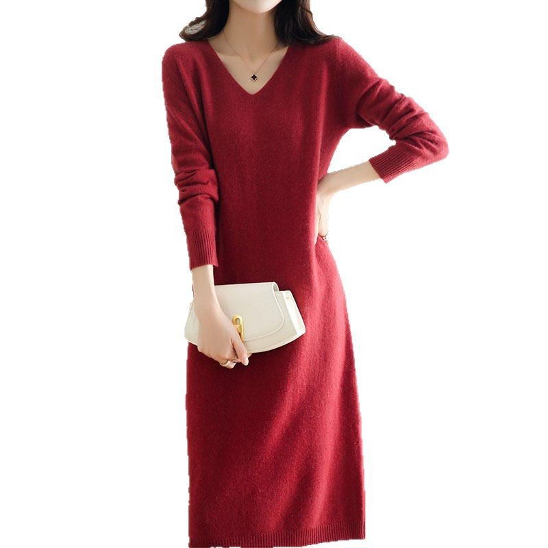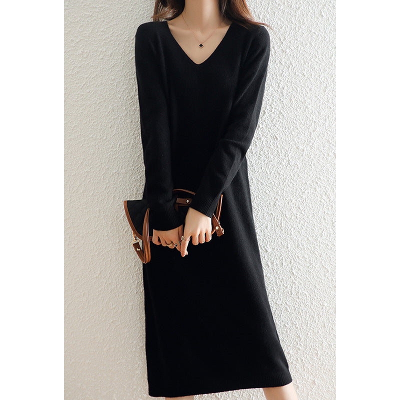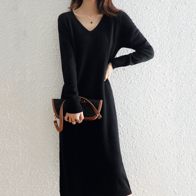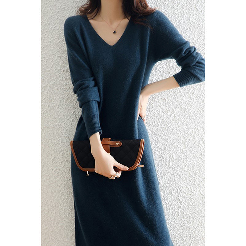 Autumn And Winter Coat V-Neck Wool Knitted Dress Women Winter Loose High-End High-End Skirt