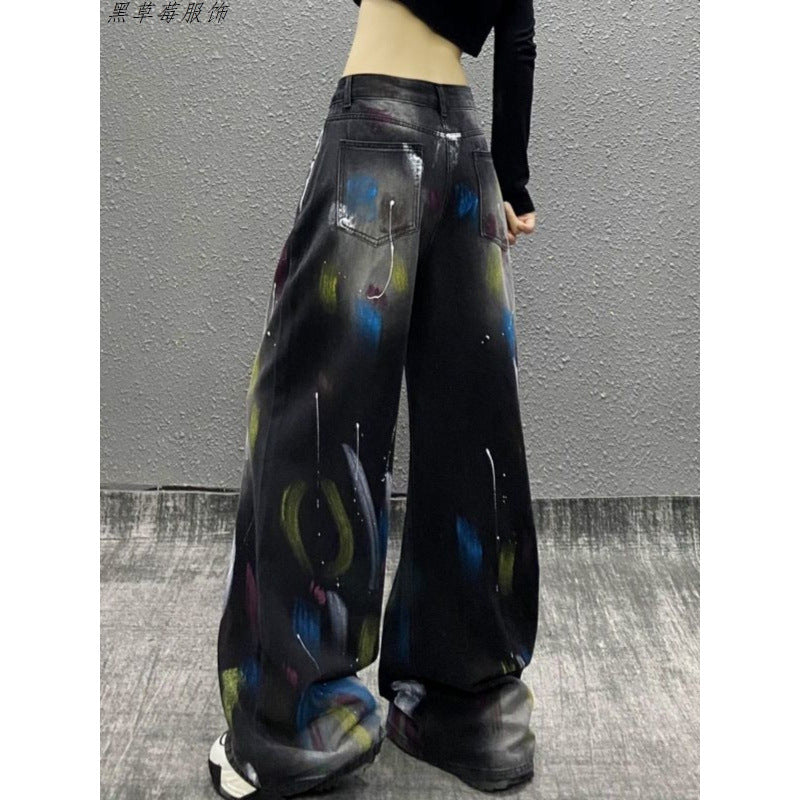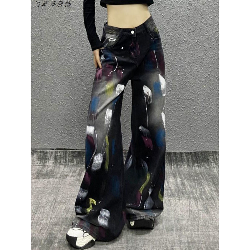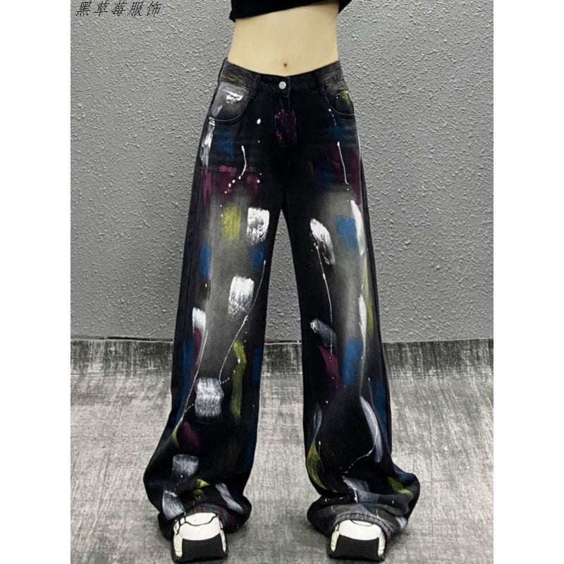 Colored Cowboy Broad-Legged Trousers In Autumn Personality Painted New High-Waisted Loose Thin Temperament Casual Pants
