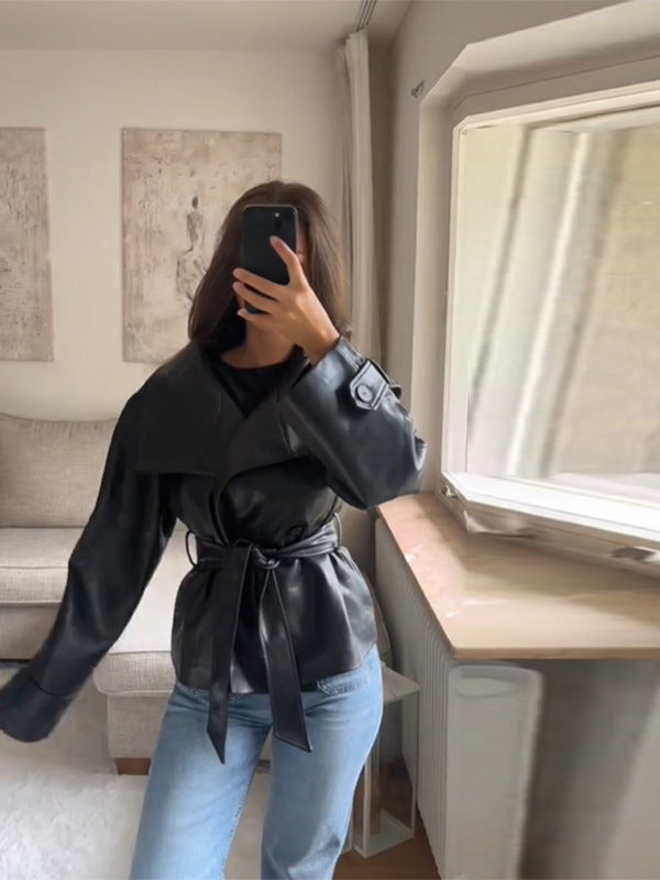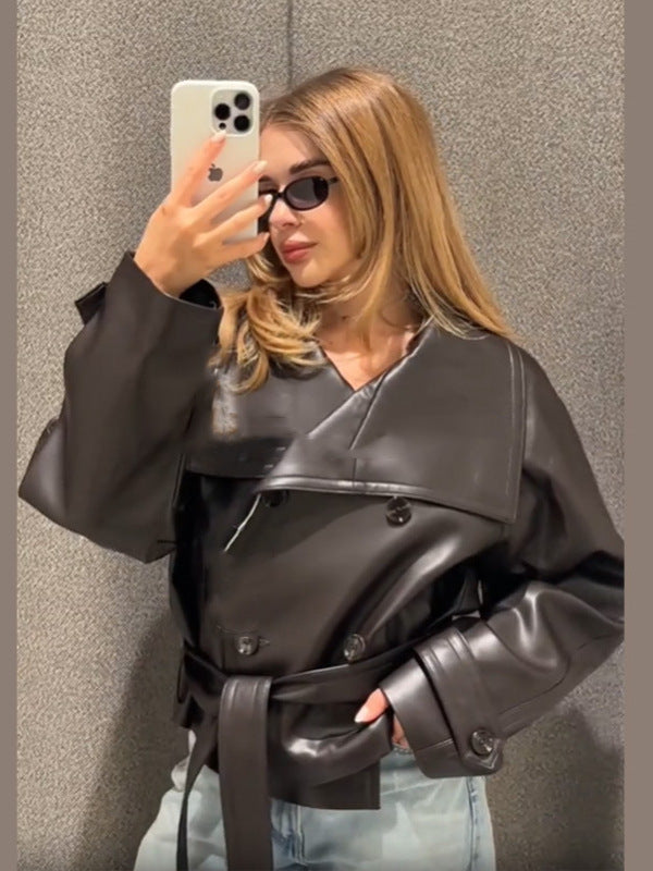 Double-Ded Buckle Short-Ed Leather Coat - Black