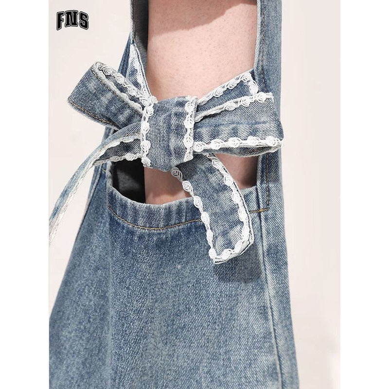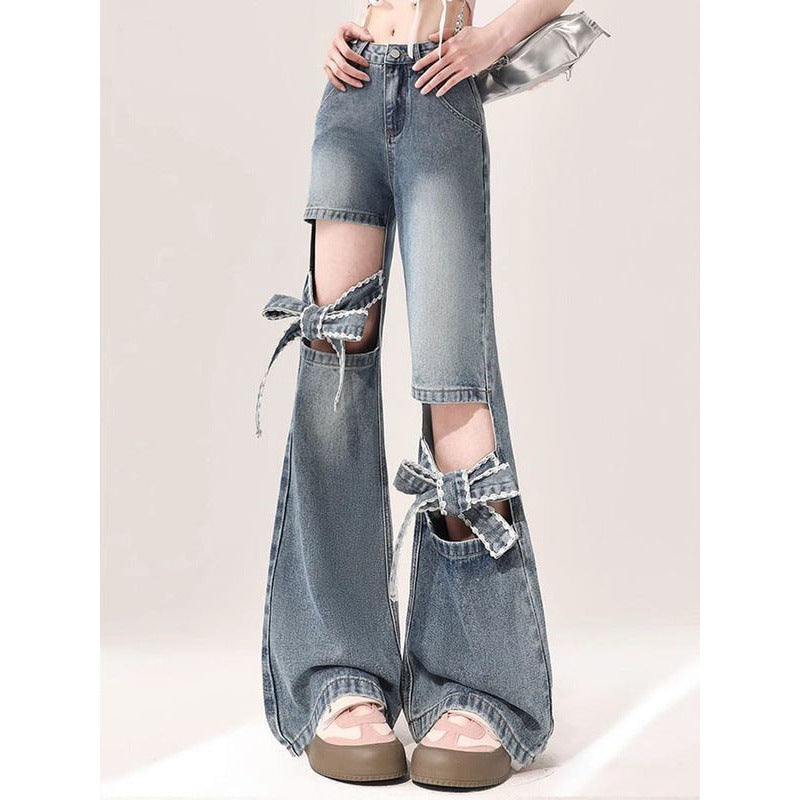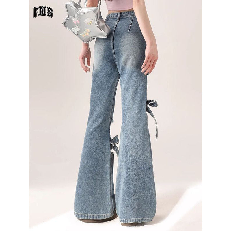 Fat Mm Large Street Hottie Bow Trumpet Micro-Tight Jeans Girl Retro Hollow Horn Long Pants