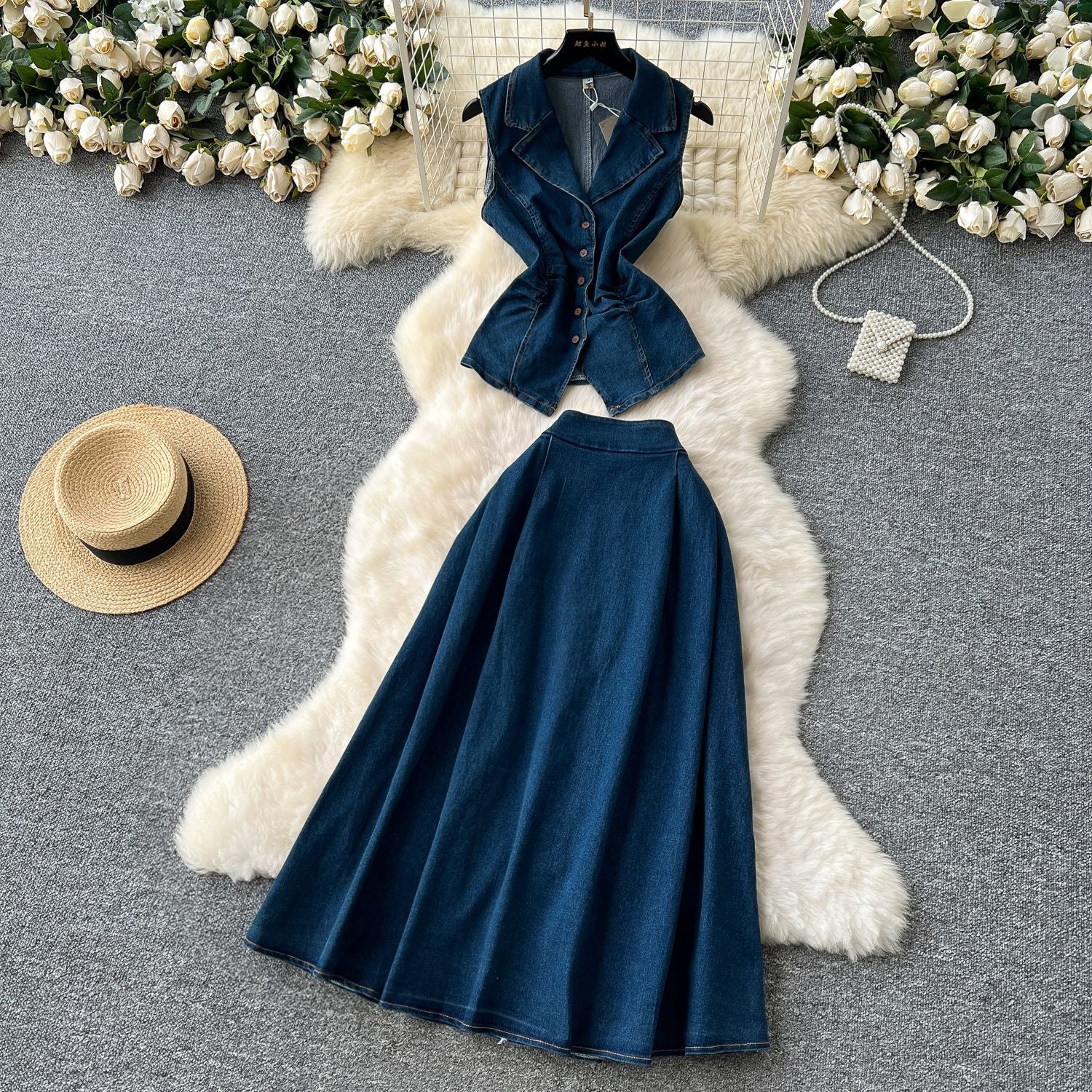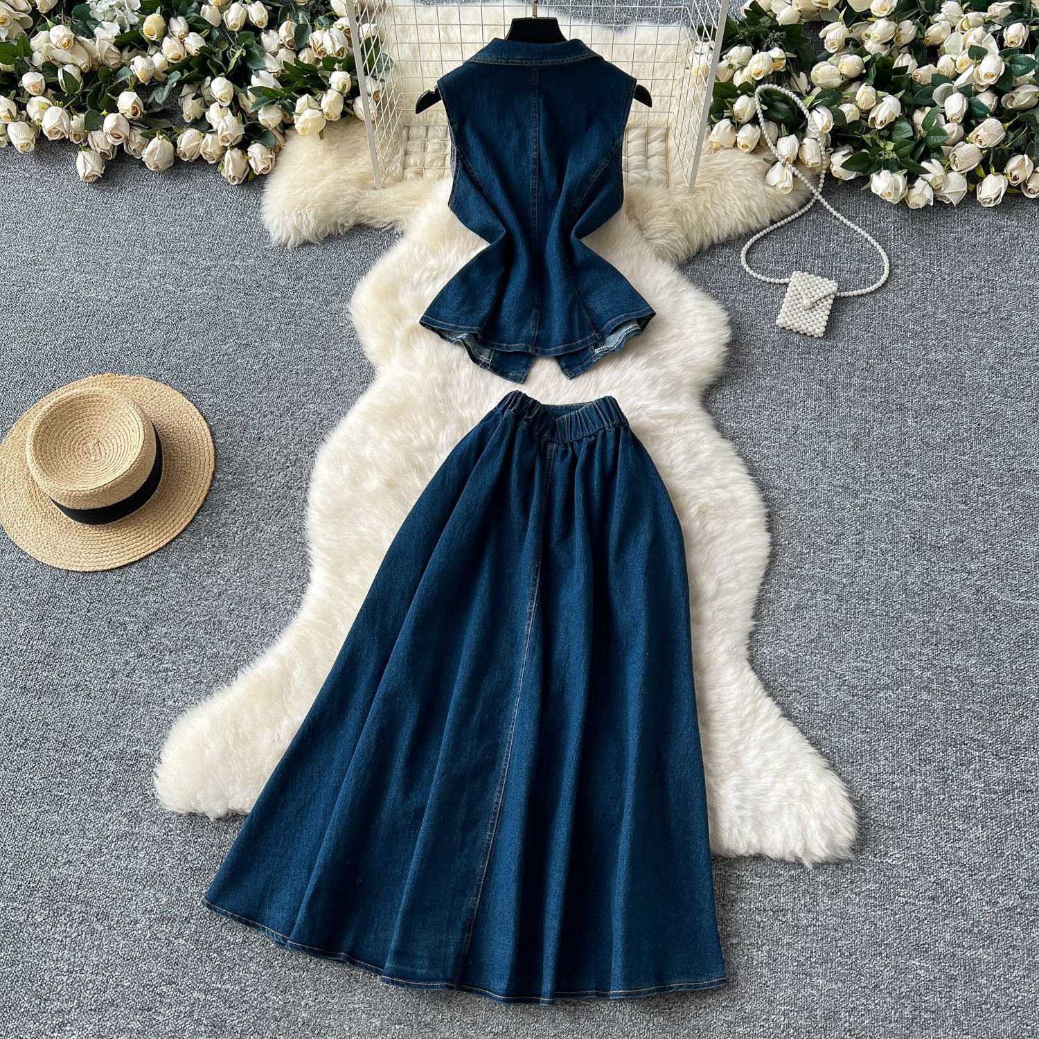 French Age-Down Suit Women's Summer Ripe Wind Folds Back-Clip-Free Denim Blouse + High Waist Half