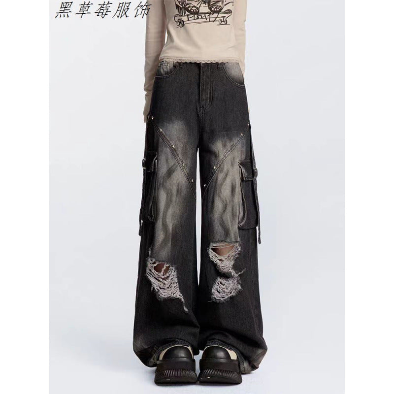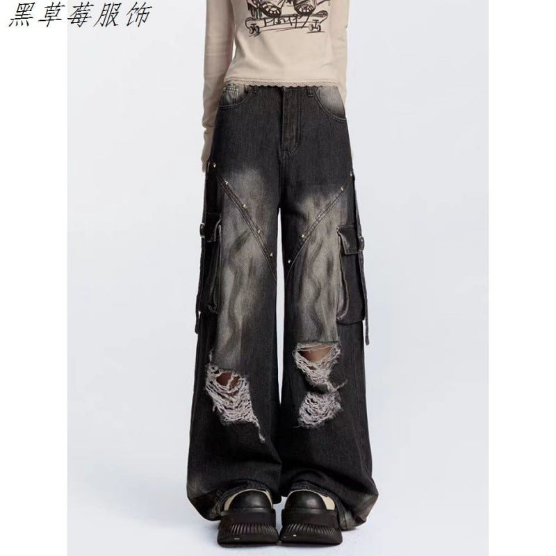 High Street Ins Do Old Tuxed Hole Jeans Women's New High-Rise Loose Thin Leg Pants