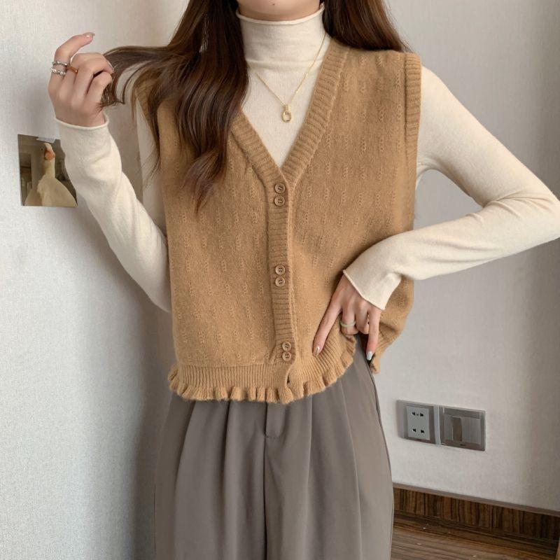 Knitted Vest Women's 2025 New Wear Early Spring Wooden Ear-Side Sweater Vest Stacked Shoulder Woman