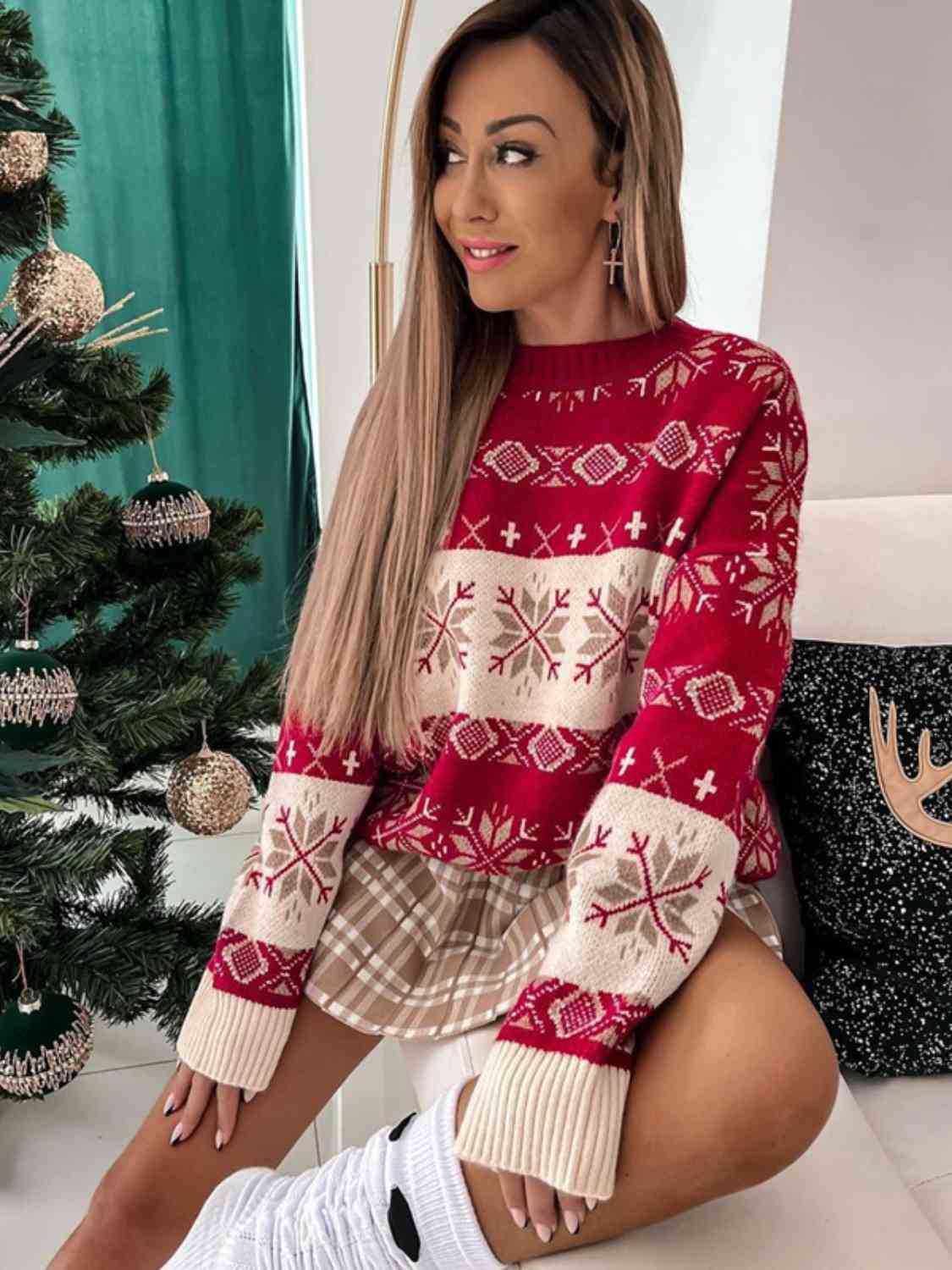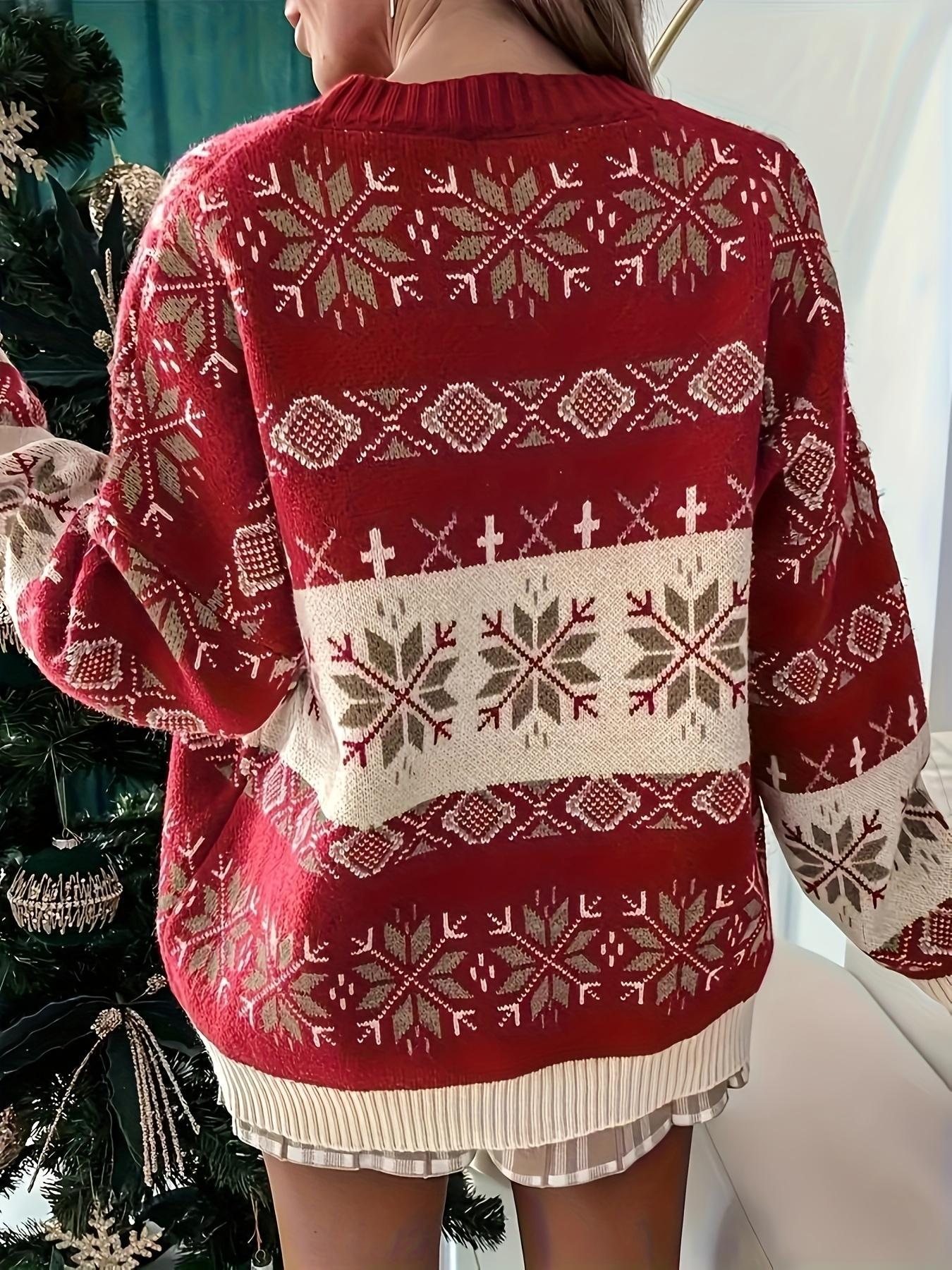 New Women's Round-Neck Red Knitted Blouse Casual Snowflake Christmas Sweater