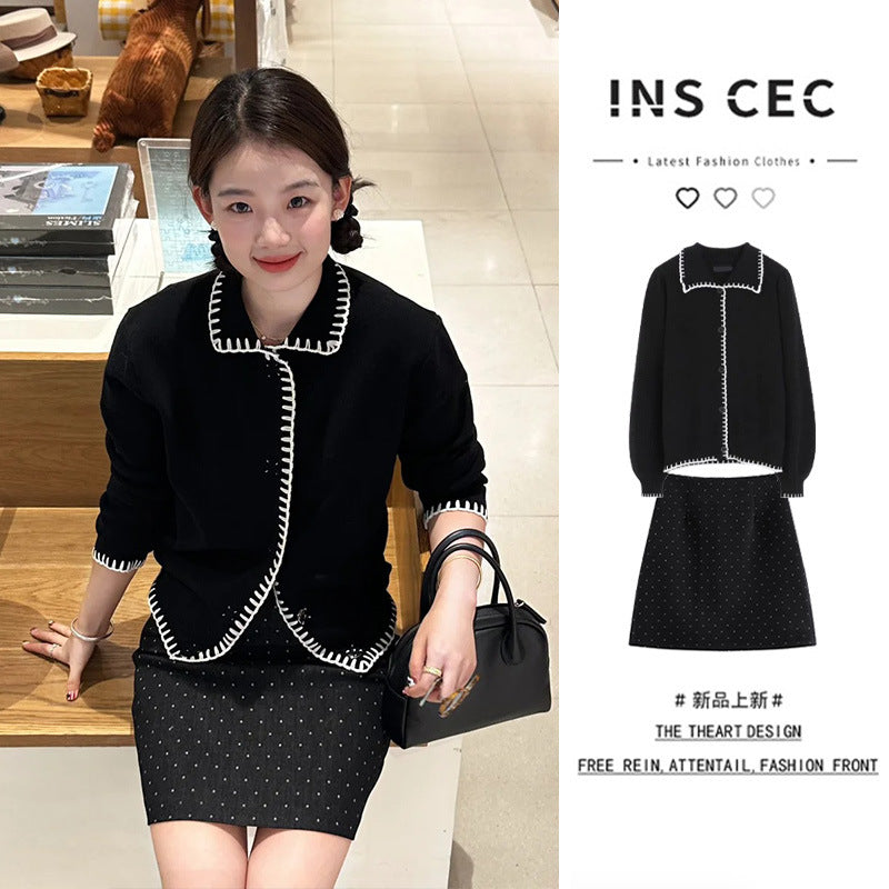 Small Fragrant Wind Collared Sweater Cardigan Women Loose Lazy Wind Wearing A Short Skirt Two Sets Of Autumn