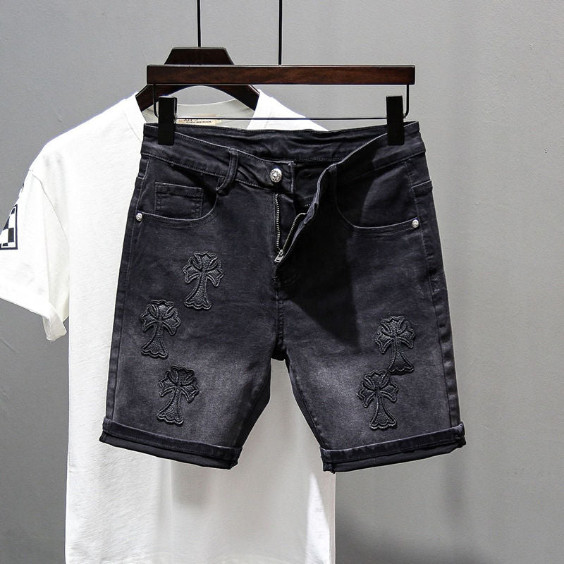 Stylish Black Denim Shorts Men's Summer Slim Retro Mids Pants Gradient Elastic Five-Point Trousers
