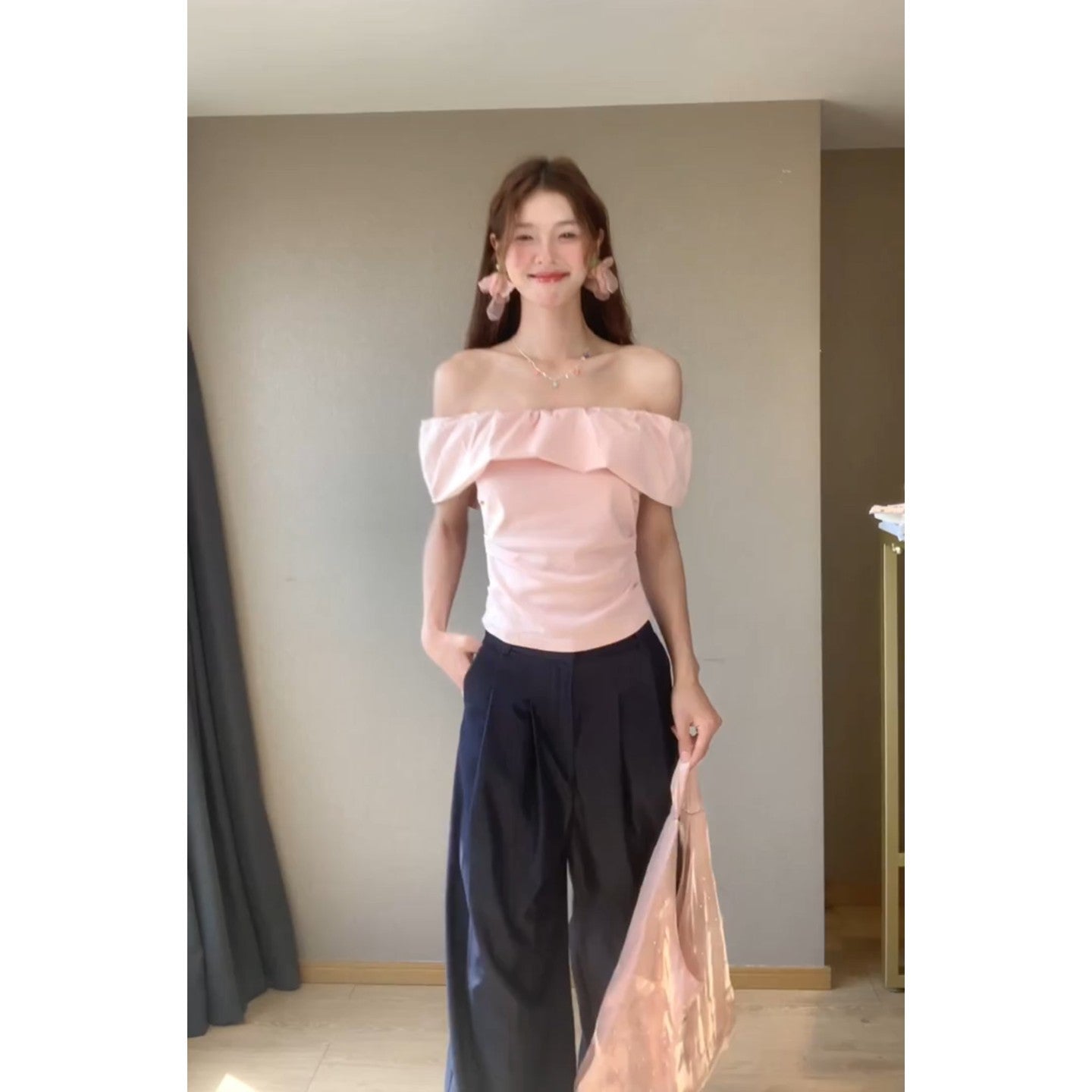 Travel And Wear The Atmosphere Of The Lotus Leaf Side Shoulder Repair Folding Top With Straight Leisure Long Pants Set