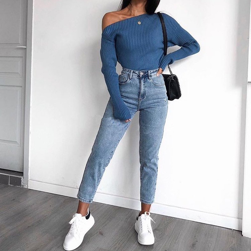 Women's Spring New Sexy Fashion Long-Sleeved Knitted Shirt Slanted Shoulder Sweater Top Woman